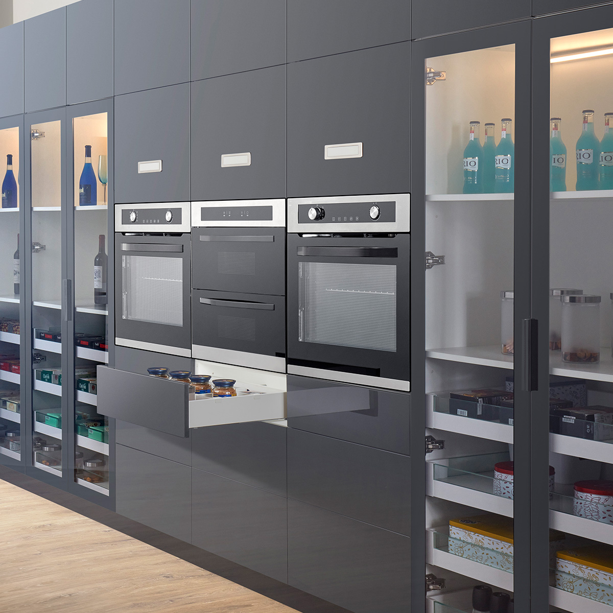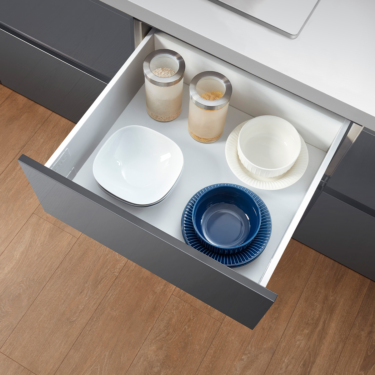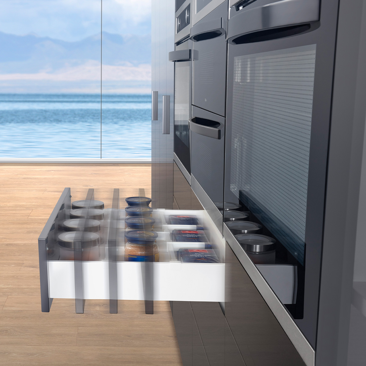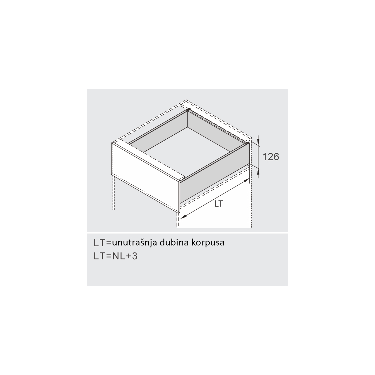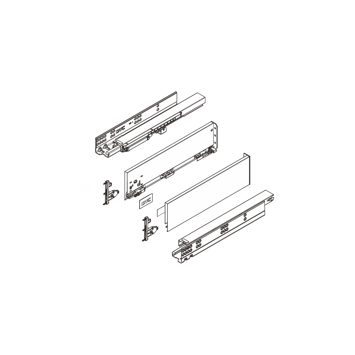 Set se sastoji od skrivenih klizača sa integrisanim usporivačima 350mm dužine, metalnim stranicama visine 126mm i svim pratećim elementima za montažu iste.