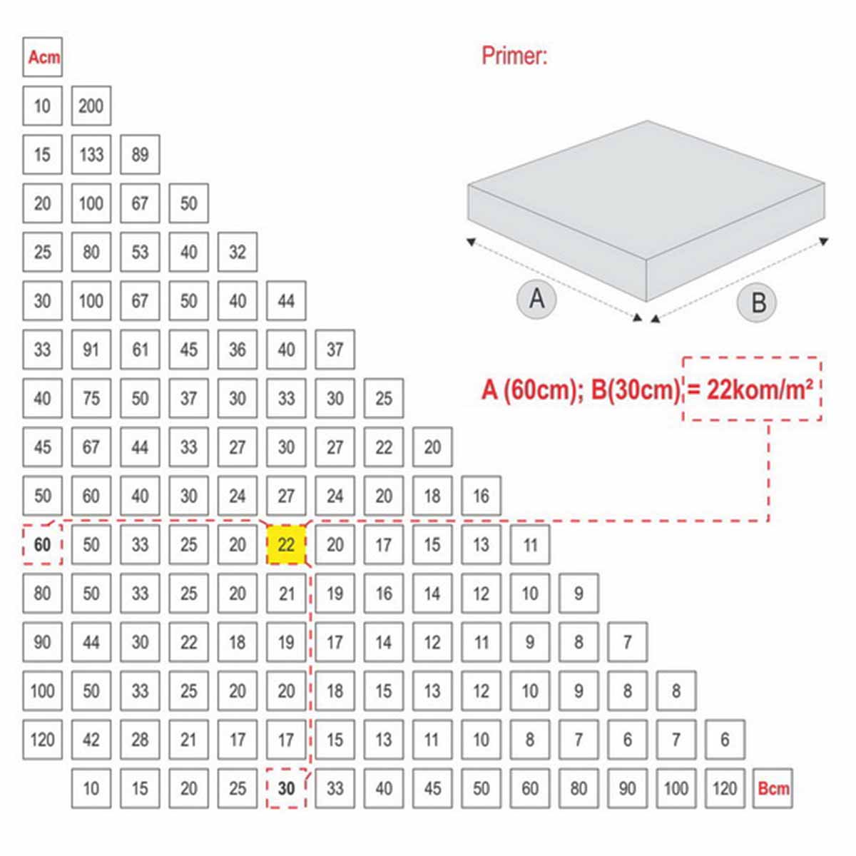 Pogledajte tabelu za izračunavanje broja komada pvc šnala i pvc klinova u odnosu na dimenziju pločice po m².