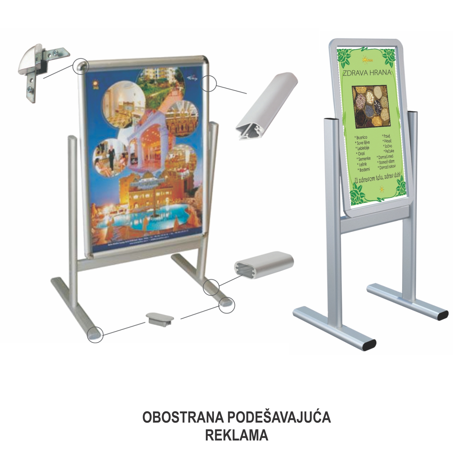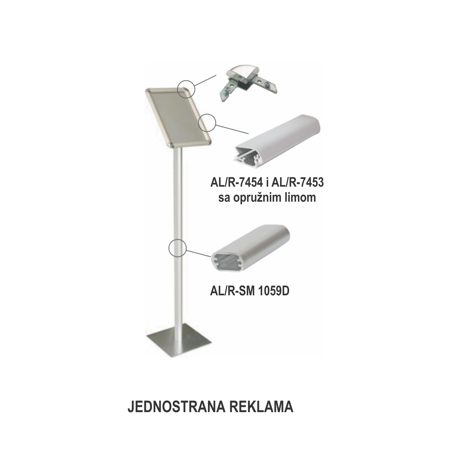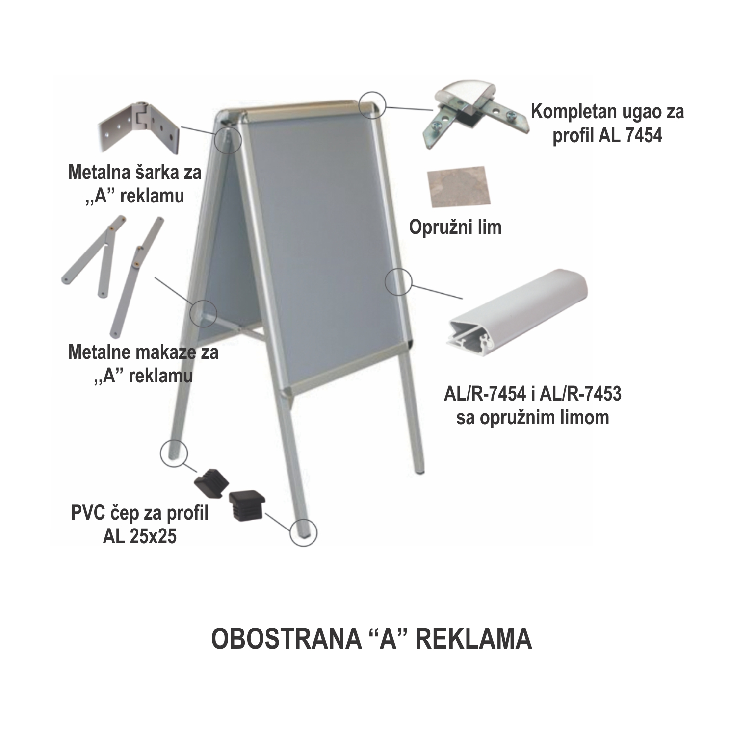 Kompletan ugao za klik-klak profile Al/R-7454 i Al/R-7453 koristi se kod izrade obostrane A reklame, zidne info table, info stub reklame.