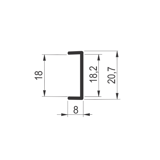 Aluminijumski kant profil 48/18.2mmDekorativni Al kant profil 48/18.2 se koristi prilikom izrade nameštaja od pločastog materijala.Kant profil je namenjen za pločasti materijal debljine 18mm.Završna obrada 48/18.2 profila je proces hemijske eloksaže.Prodajna dužina profila: 3mBoja eloksaže: Srebro mat
