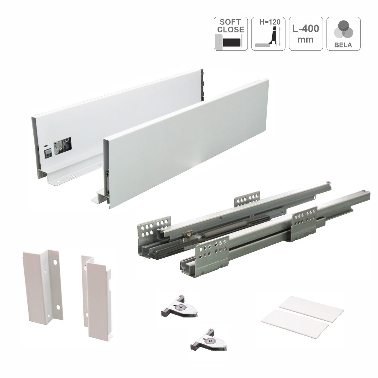 Set se sastoji od skrivenih klizača sa intergrisanim usporivačima 400mm dužine, metalnim stranicama visine 120mm i svim pratećim elementima za montažu iste.