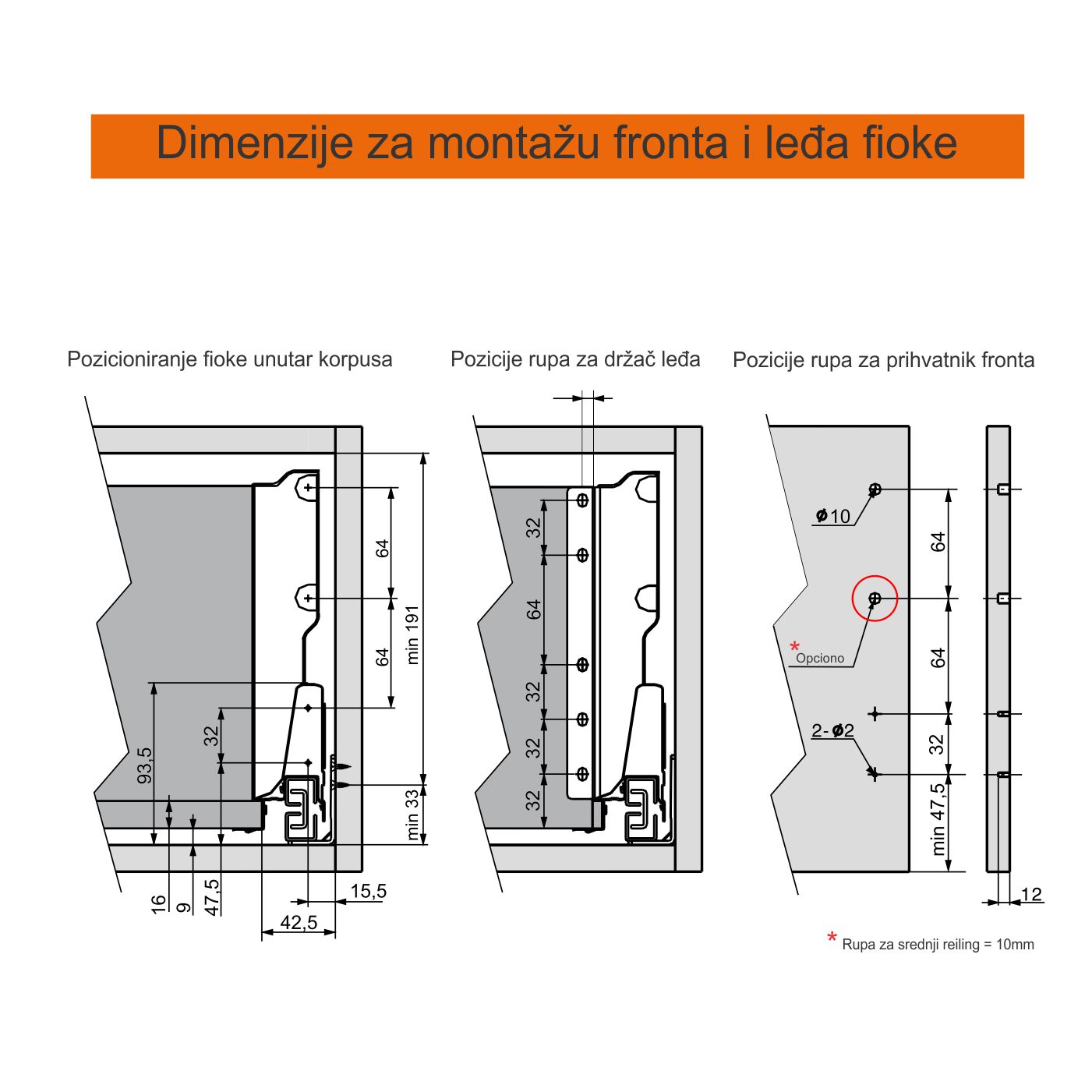 U prodajnom setu se nalazi: Par skrivenih klizača, par prihvatnika za front, par nosača leđa fioke za dva reilinga, par reilinga sive boje, par metalnih stranica sive boje, dve dekortivne kape za metalne stranice kao i uputstvo za montažu fioke.