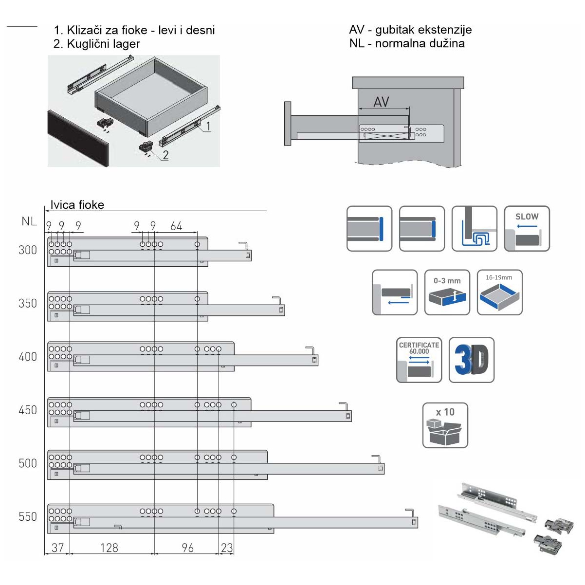 Za debljinu bočnih stranica fioke do 16mm.