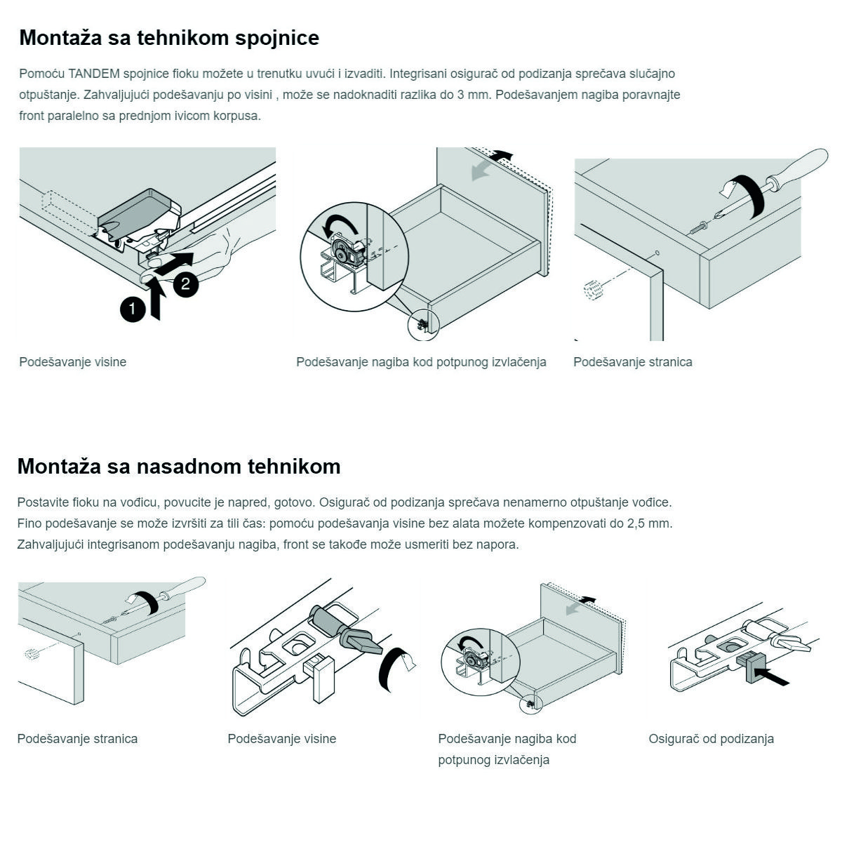 Skriveni sistem vođica je opteretiv maksimalno do 30 kg i dostupan je kao delimično izvlačenje što je idealno rešenje za mali nameštaj poput noćnog ormarića.