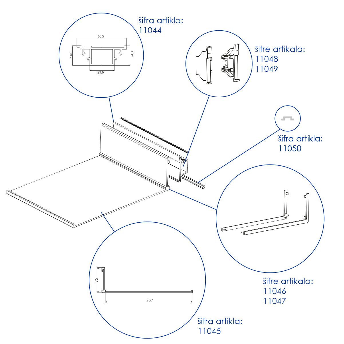 Sadrži dva integrisana kanala za LED trake sa zadnje strane profila, kao i PVC difuzore za iste koji se uvlače u kanale.