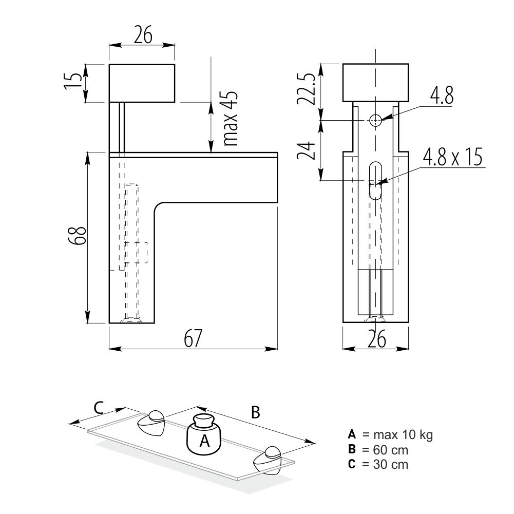 Višenamenski nosač polica koji se montira na zid, namenjen je za drvene i za staklene police maksimalne debljine do 45mm.