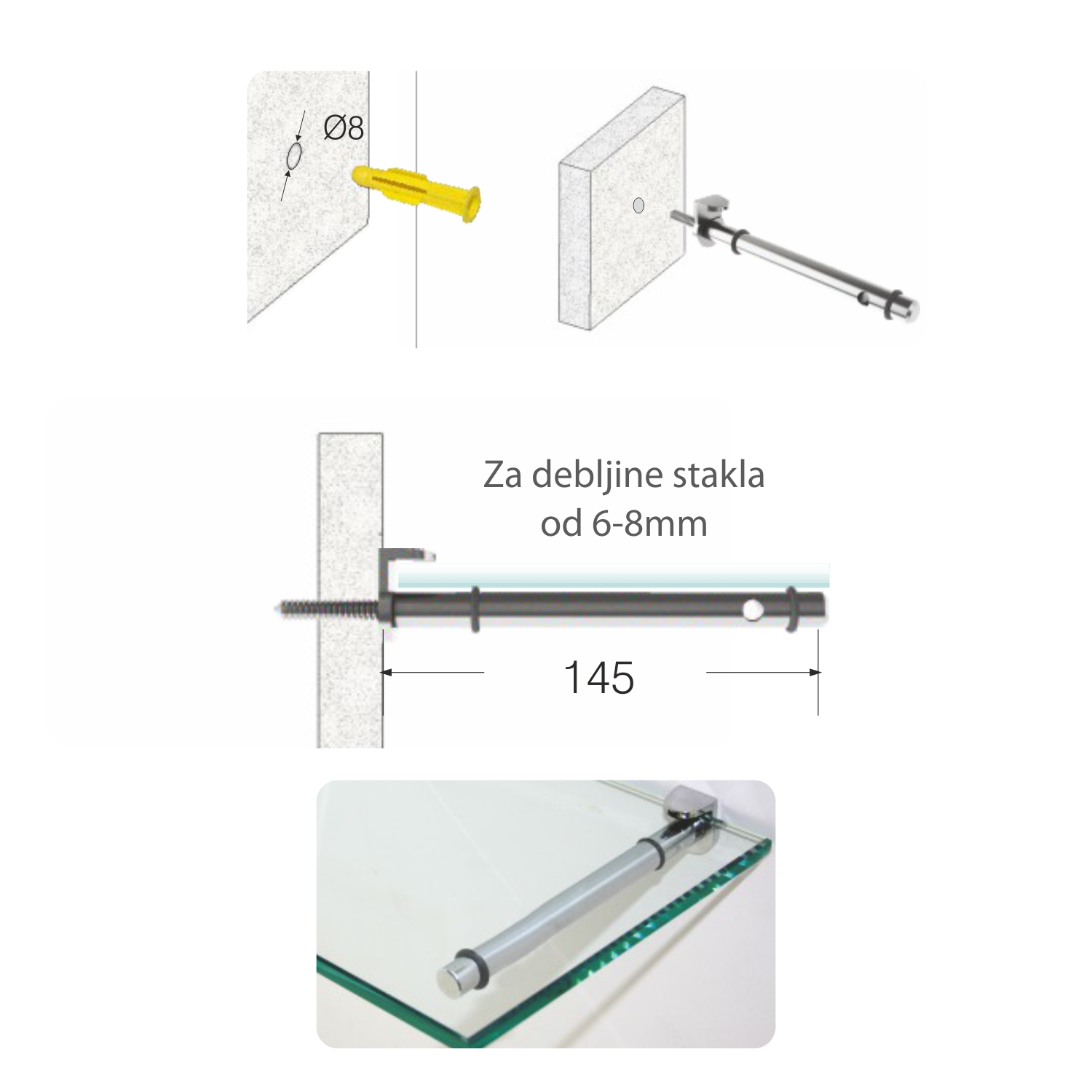Metalni nosač je namenjen za zidno kačenje staklenih polica od 6 do 8mm debljine.