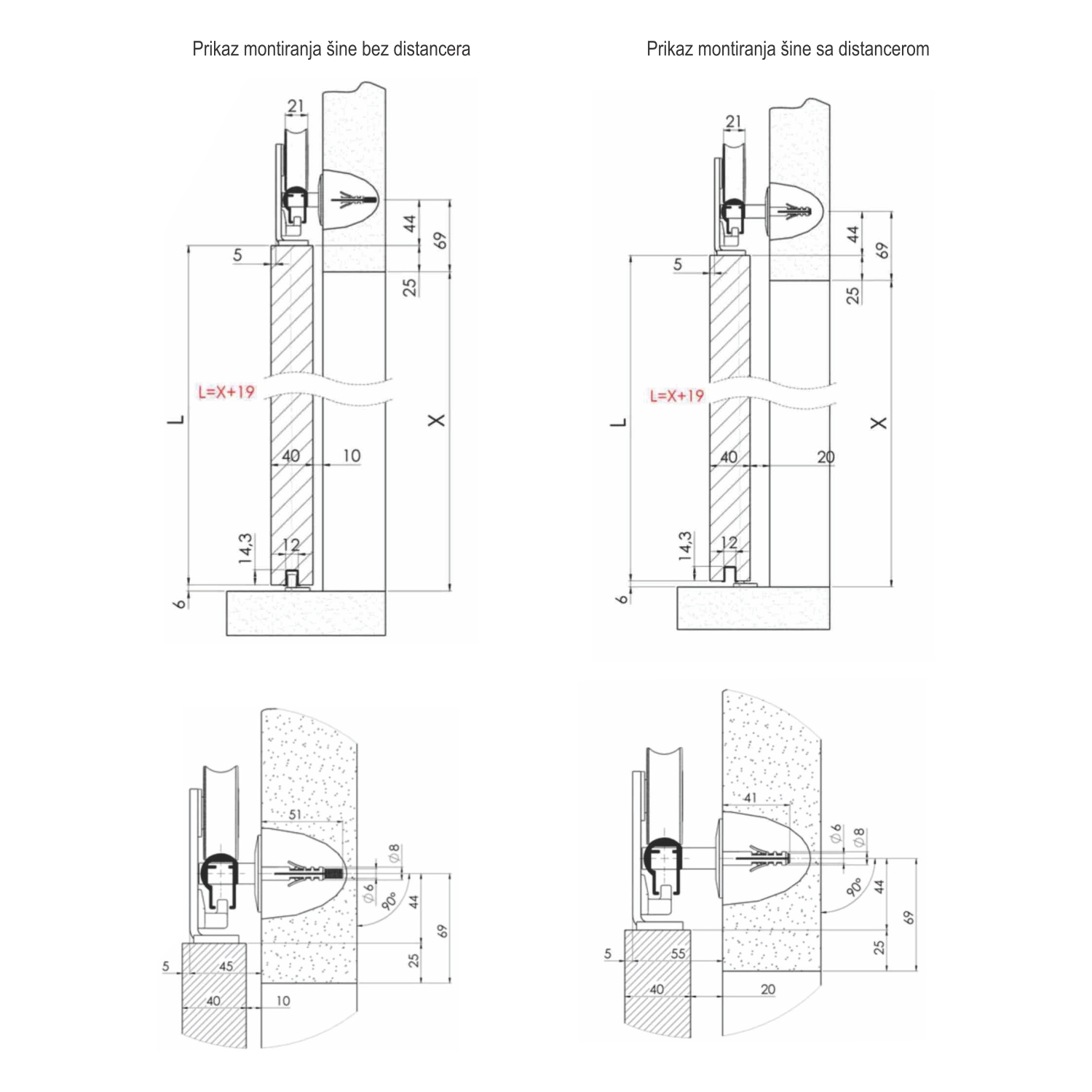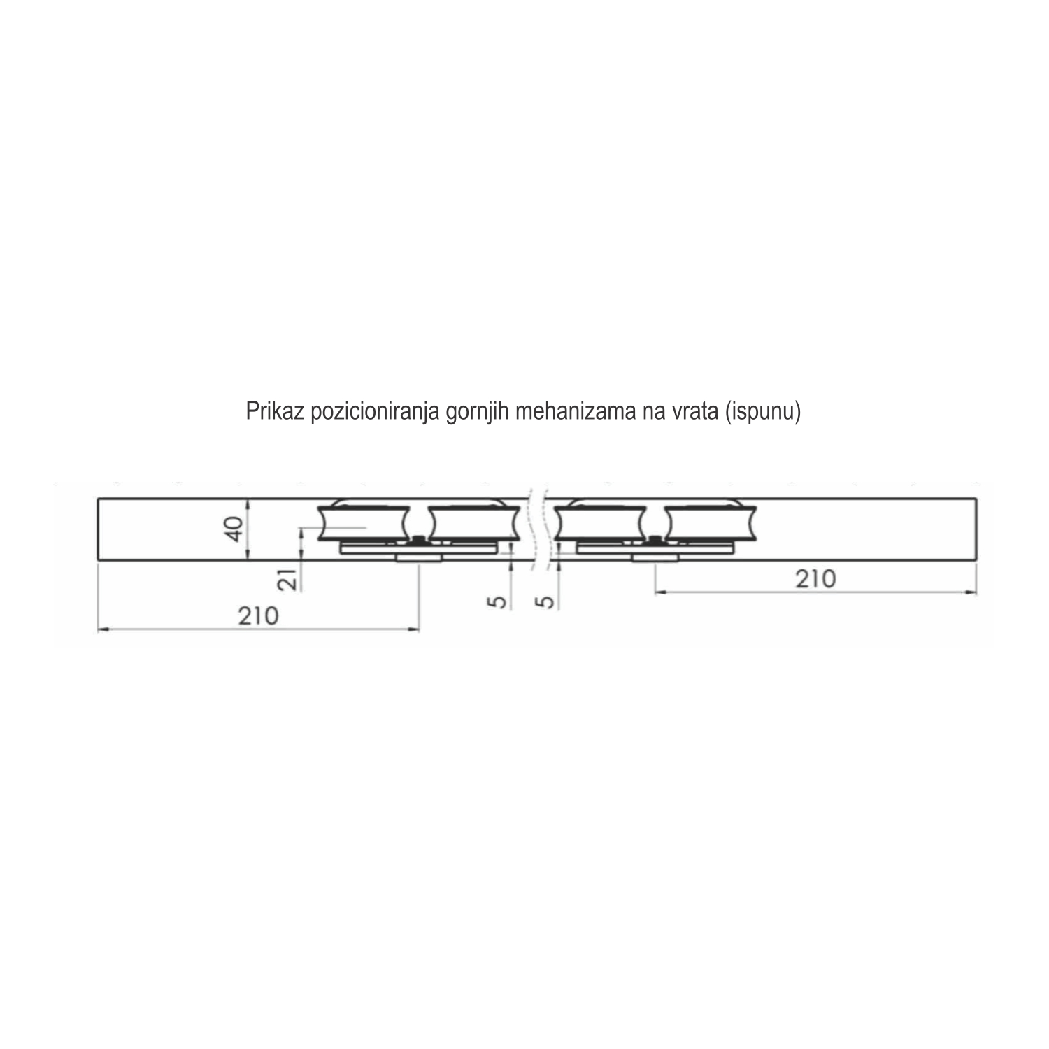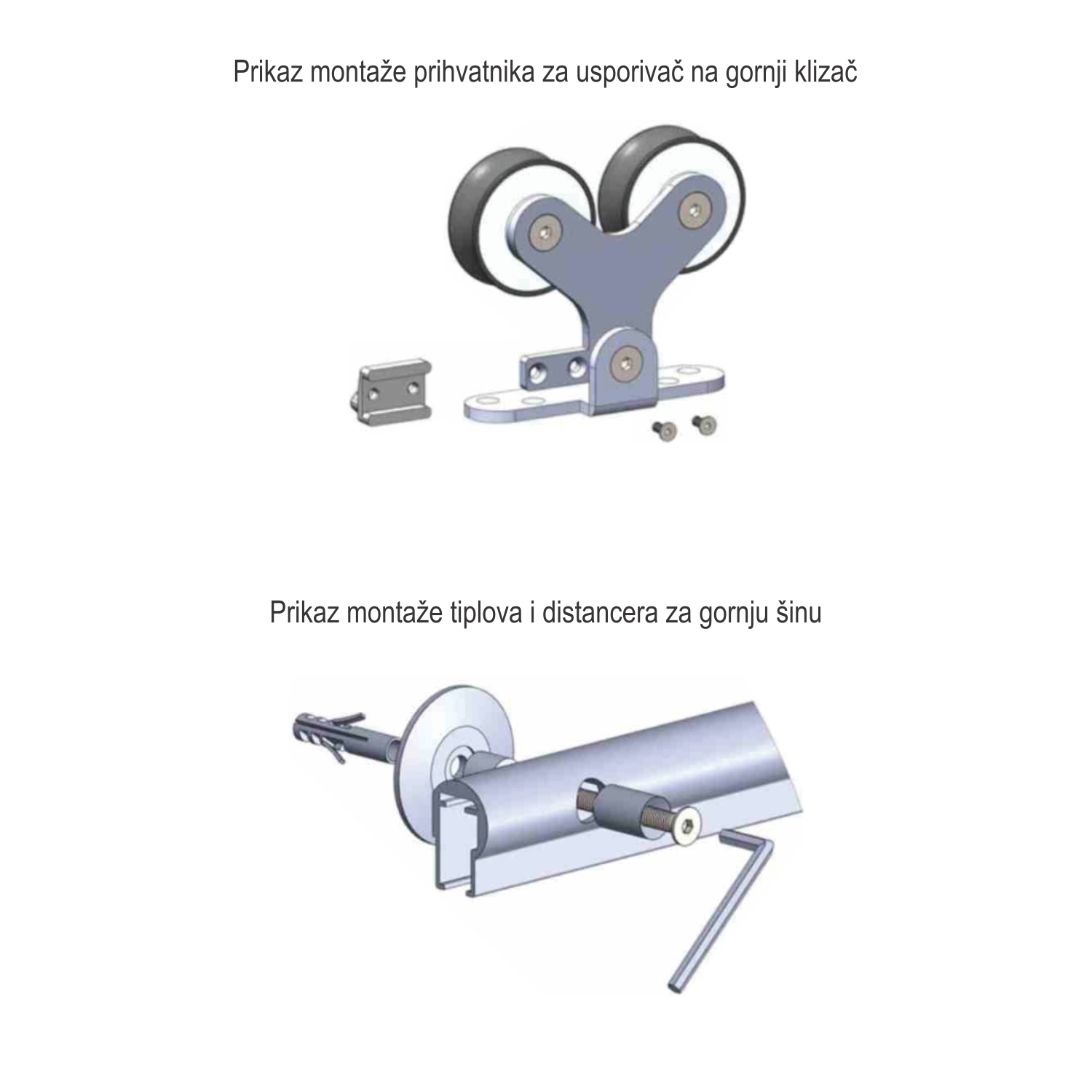 U prodajnom setu se nalaze gornji točkići za vrata, usporivači, usmerivač pravca kao i potrebni vijci za montažu šine na zid.