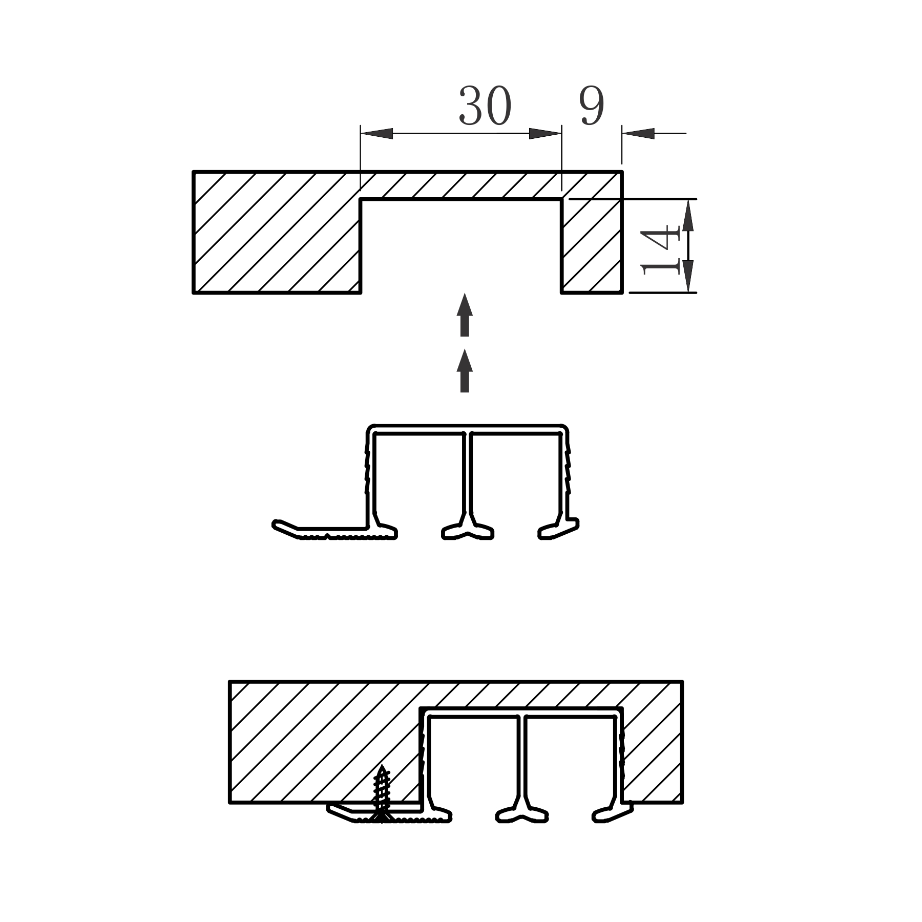 Šina se ukopava u pločasti materijal prilikom montaže.