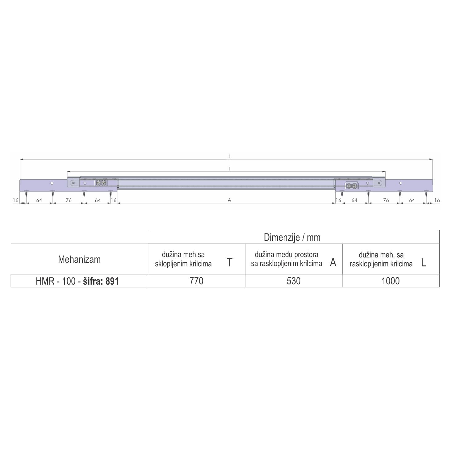 Dužina mehanizma sa sklopljenim krilcima je 770mm, dužina međuprostora za produžetak stola je 530mm, a dužina mehanizma sa rasklopljenim krilcima je 1000mm.