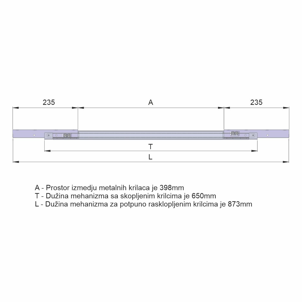 Dužina mehanizma sa sklopljenim krilcima je 650mm, dužina međuprostora za produžetak stola je 398mm, a dužina mehanizma sa rasklopljenim krilcima je 873mm.