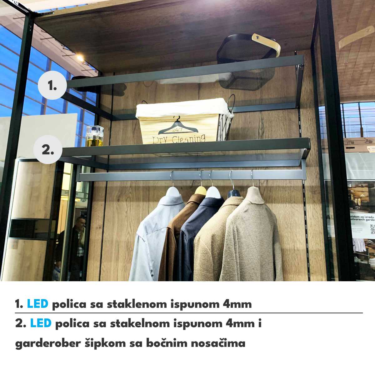 Polica je izrađena od aluminijumskih profila koji u sebi imaju integrisan kanal u koji je postavljena LED traka koja usmerava svetlost ka unurašnjosti plakara.