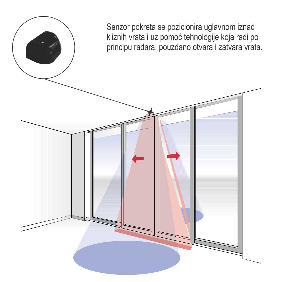 Senzor se montira iznad kliznih vrata i uz pomoć tehnologije koja radi na principu radara detektuje signal osobe koja prilazi vratima i automatski ih otvara.