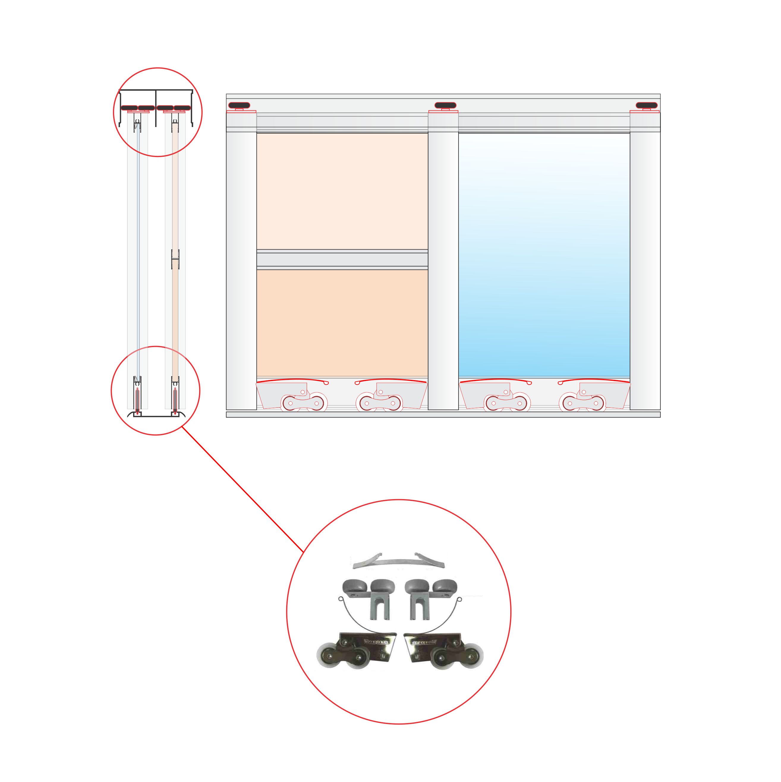 Ovaj mehanizam se koristi kada se klizna vrata rade sa asimetričnim Al rukohvatima i kada je širina vrata veća od 100cm.