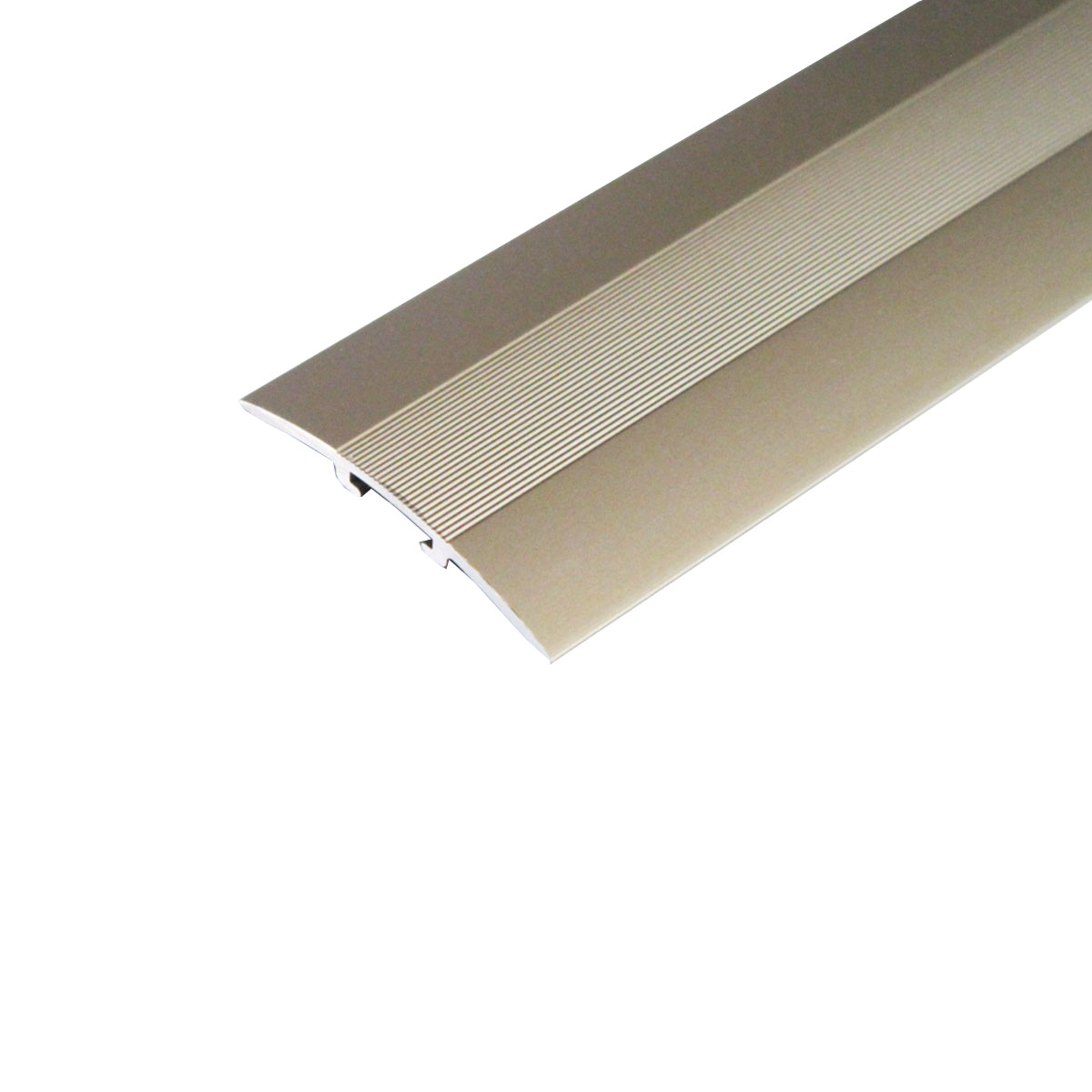 Aluminijumski dekorativni prelazni profil 3379 Profil sa skrivenim šrafom za spoj površina u istom i različitom nivou ± 5mm. Završna obrada 3379 profila je proces hemijske eloksaže, tokom kojeg se profilu dodaje sloj aluminijum oksida koji poboljšava izdržljivost i daje krajnji izgled profila. Prodajna dužina profila: 1,8m Širina profila: 40mm Debljina profila: 1,5mm Debljina eloksiranog sloja: 0,15µm Boja eloksaže: Bronza mat Montaža 3379 profila sa skrivenim šrafom se vrši na sledeći način: Nakon što izbušite rupe u podu izmedju dve podne obloge, postavite u njih tiplove a u same tiplove malo silikona. Postavite šrafove u ležište sa donje strane 3379 prelaznog profila, centrirajte šrafove na mesta na kojima se nalaze rupe. Gumenim čekićem blago nakucajte 3379 profil u predhodno izbušene rupe.