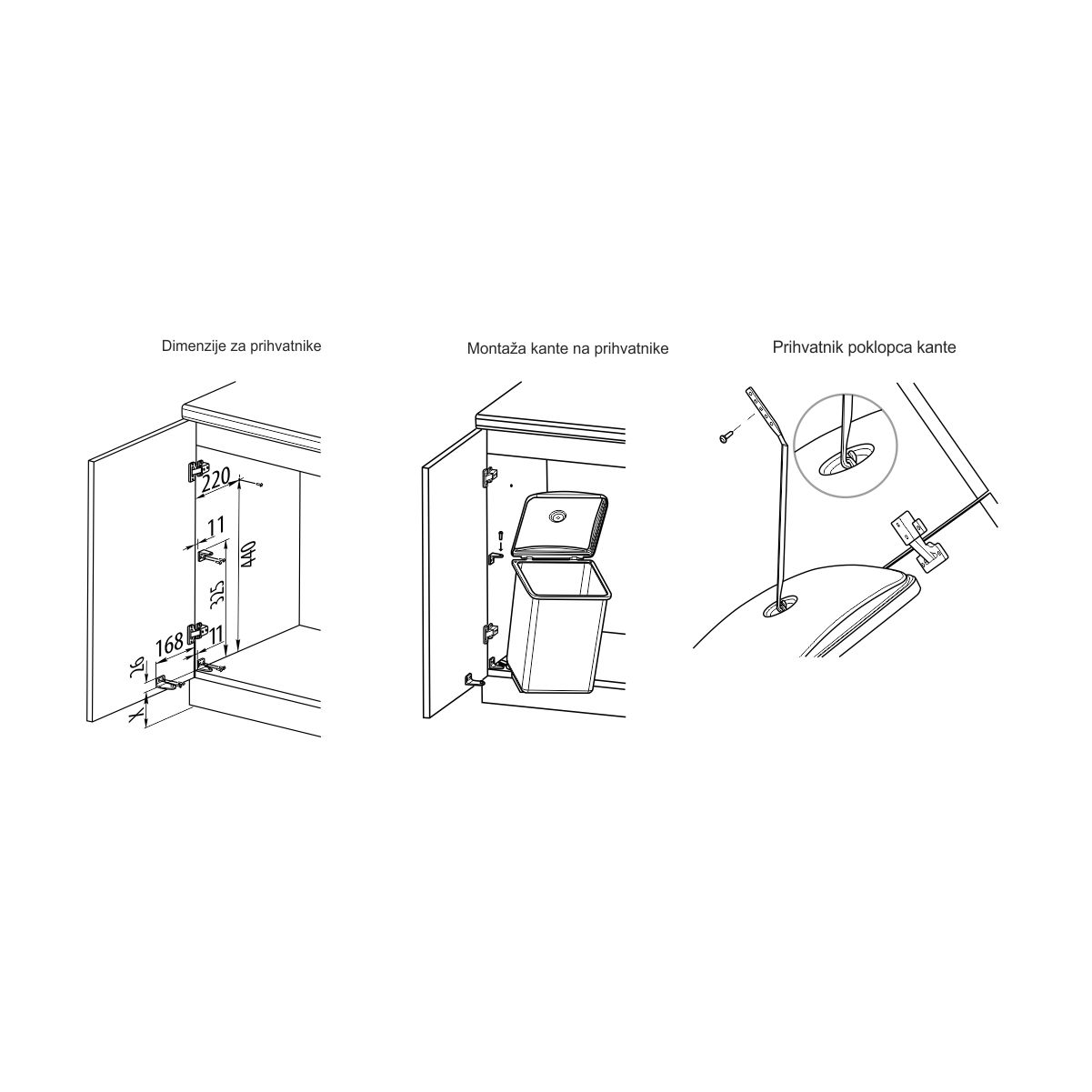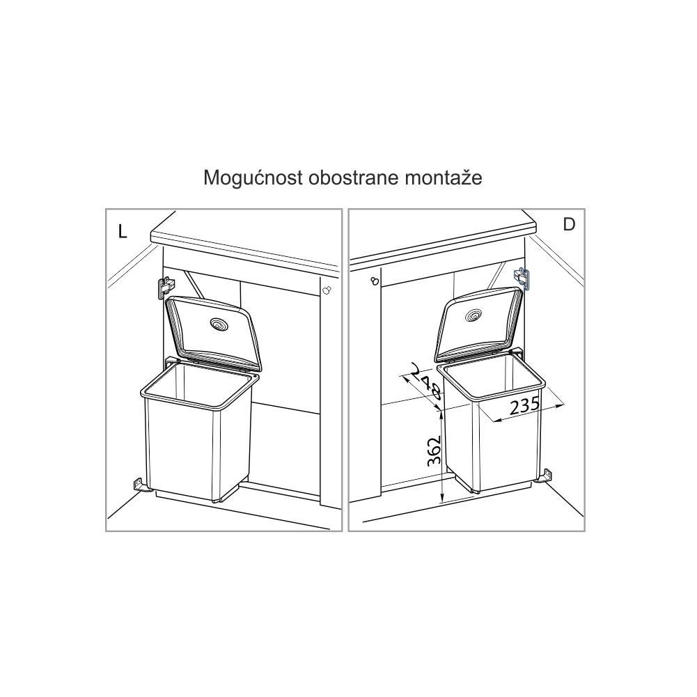 Uglavnom se montira na vrata od elementa i prilikom otvaranja vrata otvara se i poklopac korpe.