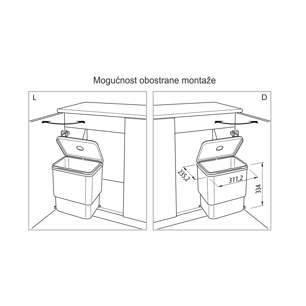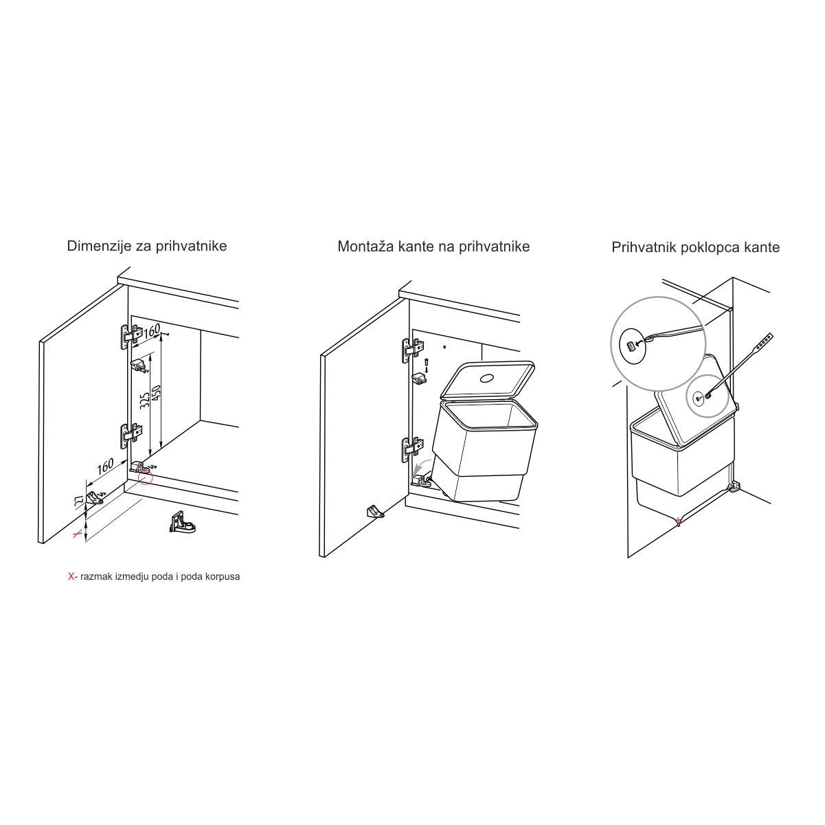 Poklopac kante se otvara prilikom otvaranja vrata od korpusa u koji je kanta montirana.