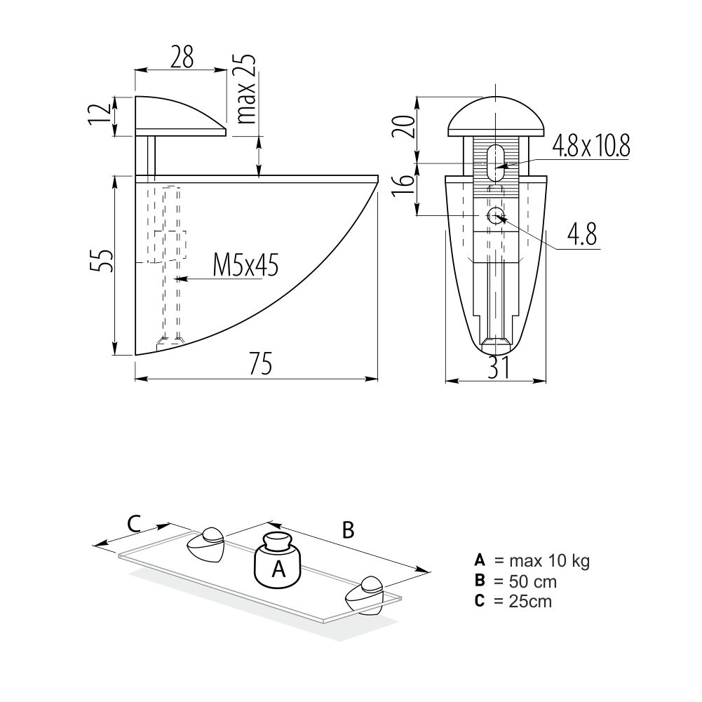 Višenamenski nosač polica koji se montira na zid, namenjen je za drvene i za staklene police maksimalne debljine do 25mm.