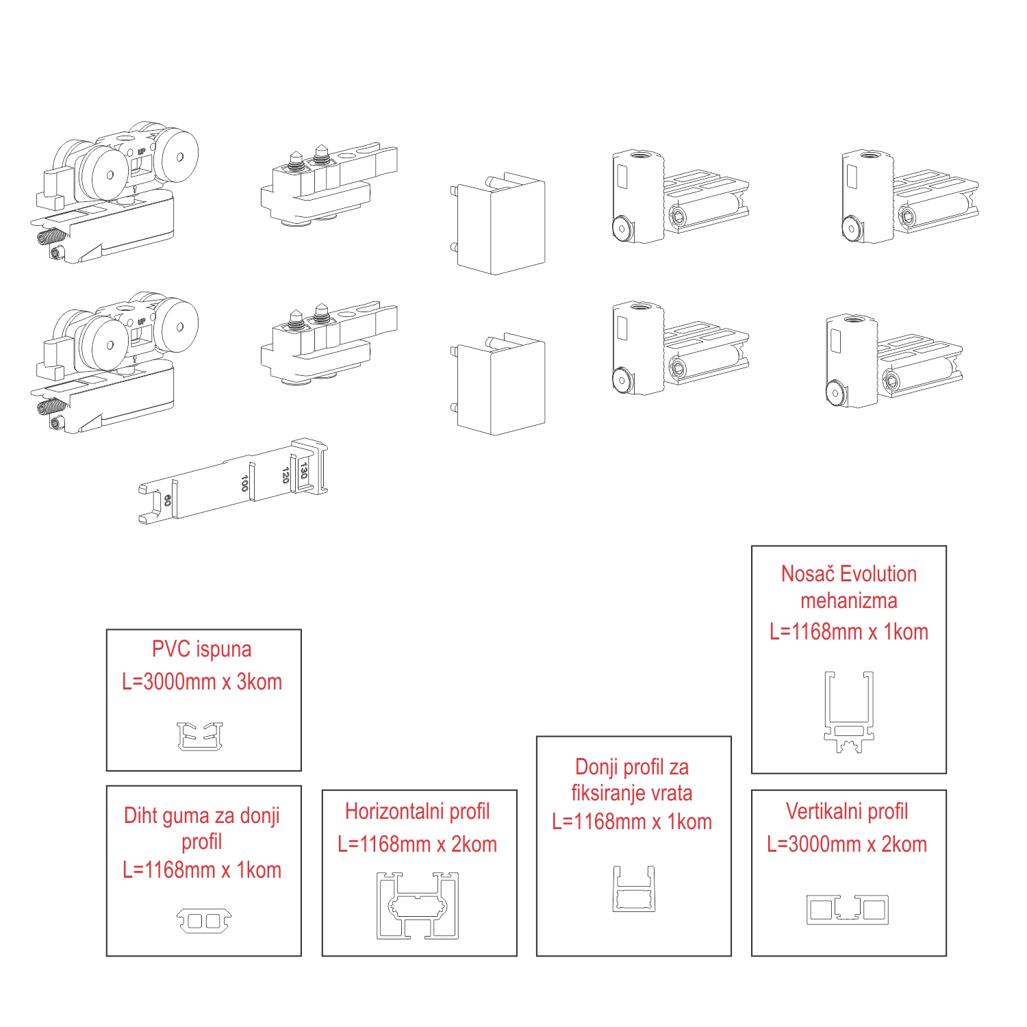 U okviru prodajnog seta se nalaze horizontalni i vertikalni Al profili za izradu staklenog fronta, veznici, PVC ispune kao i profil koji se postavlja unutar aluminijumskih profila kako bi se sprečio direktan kontakt stakla i aluminijuma.