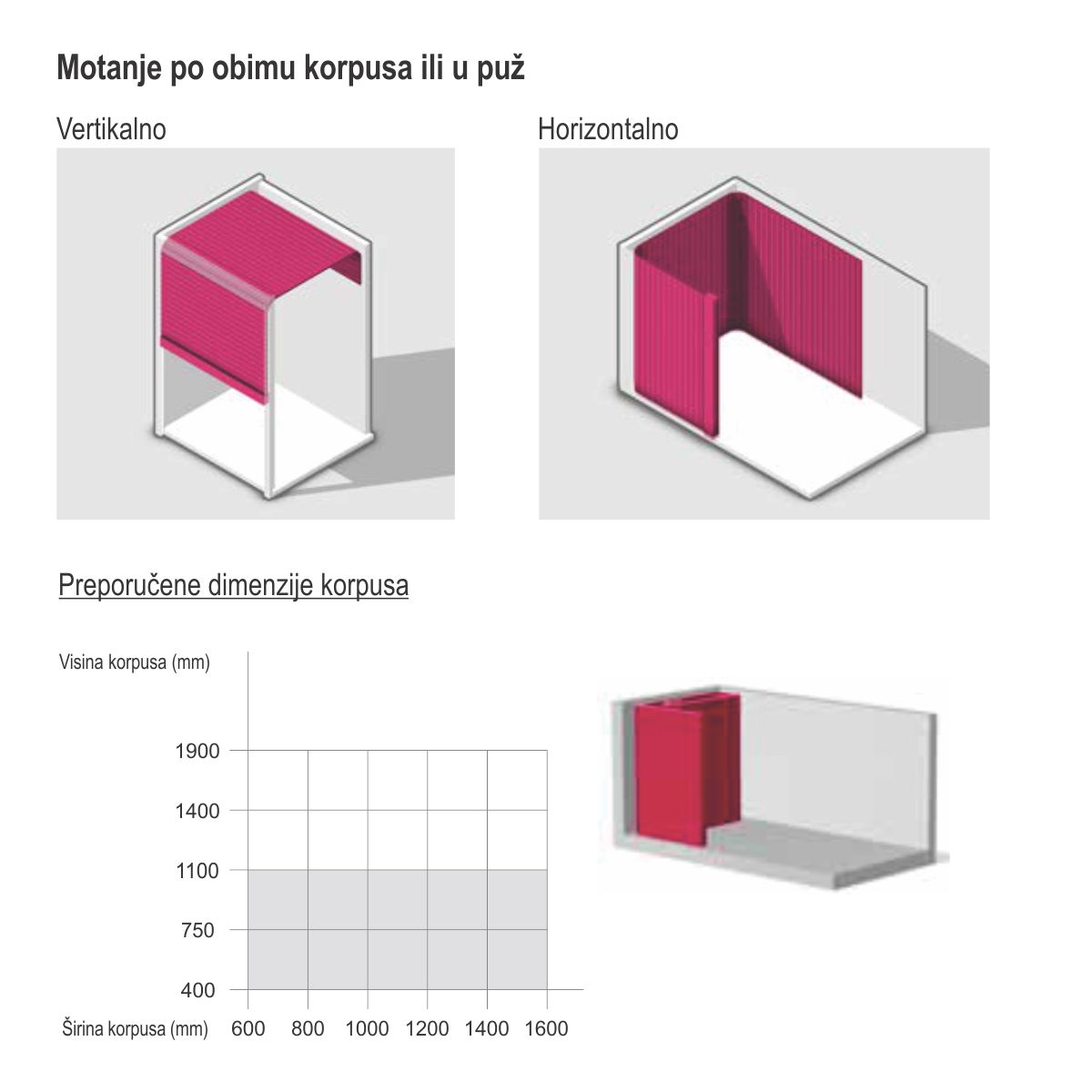 Način otvaranja Classic sistema može biti horizontalan i vertikalan a motanje roletne se vrši po obimu korpusa ili u puž vođicu.