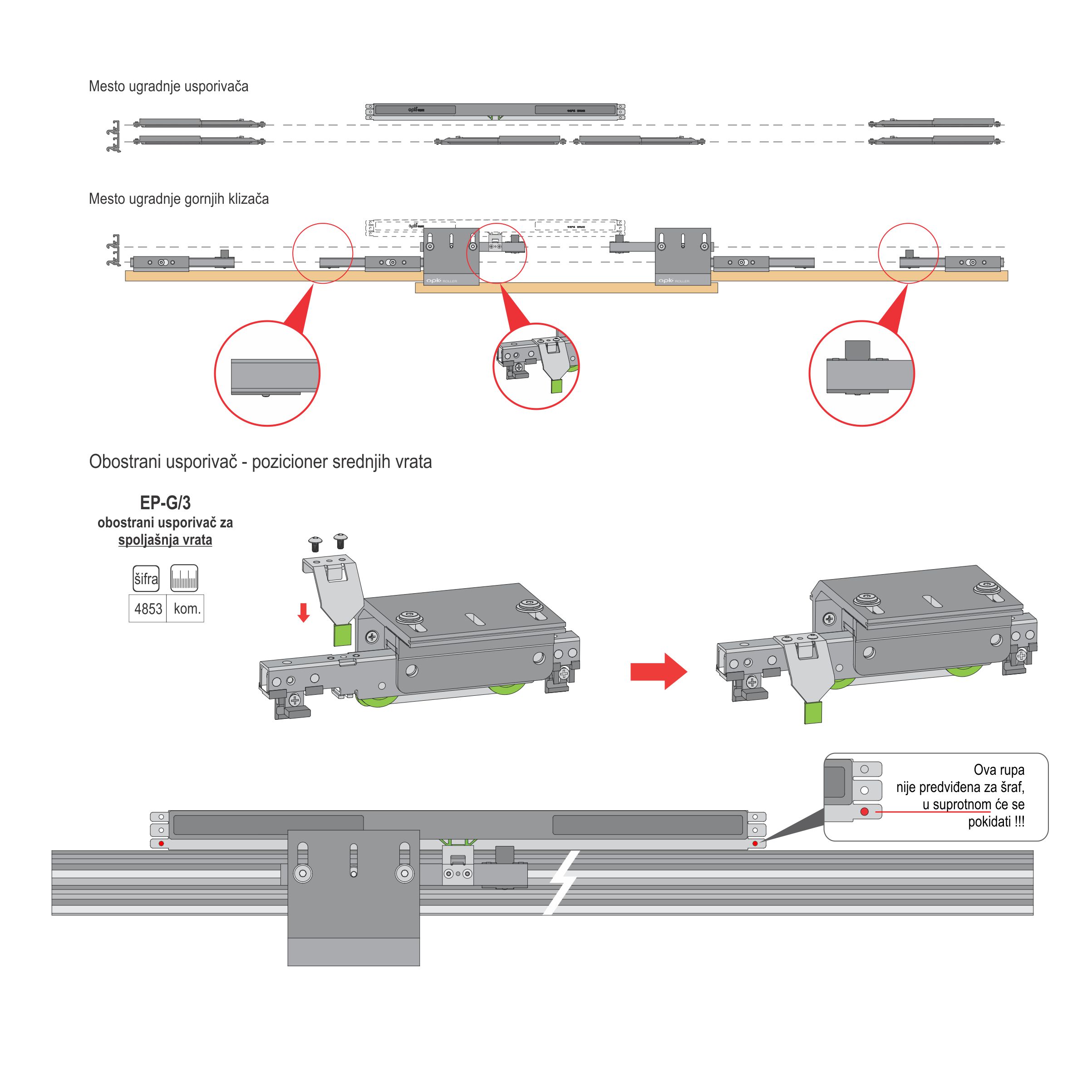 SGE G/3 obostrani usporivač - pozicioner postavlja se na spoljašnja ili srednja vrata i omogućava pozicioniranje kliznih vrata na sredini korpusa.